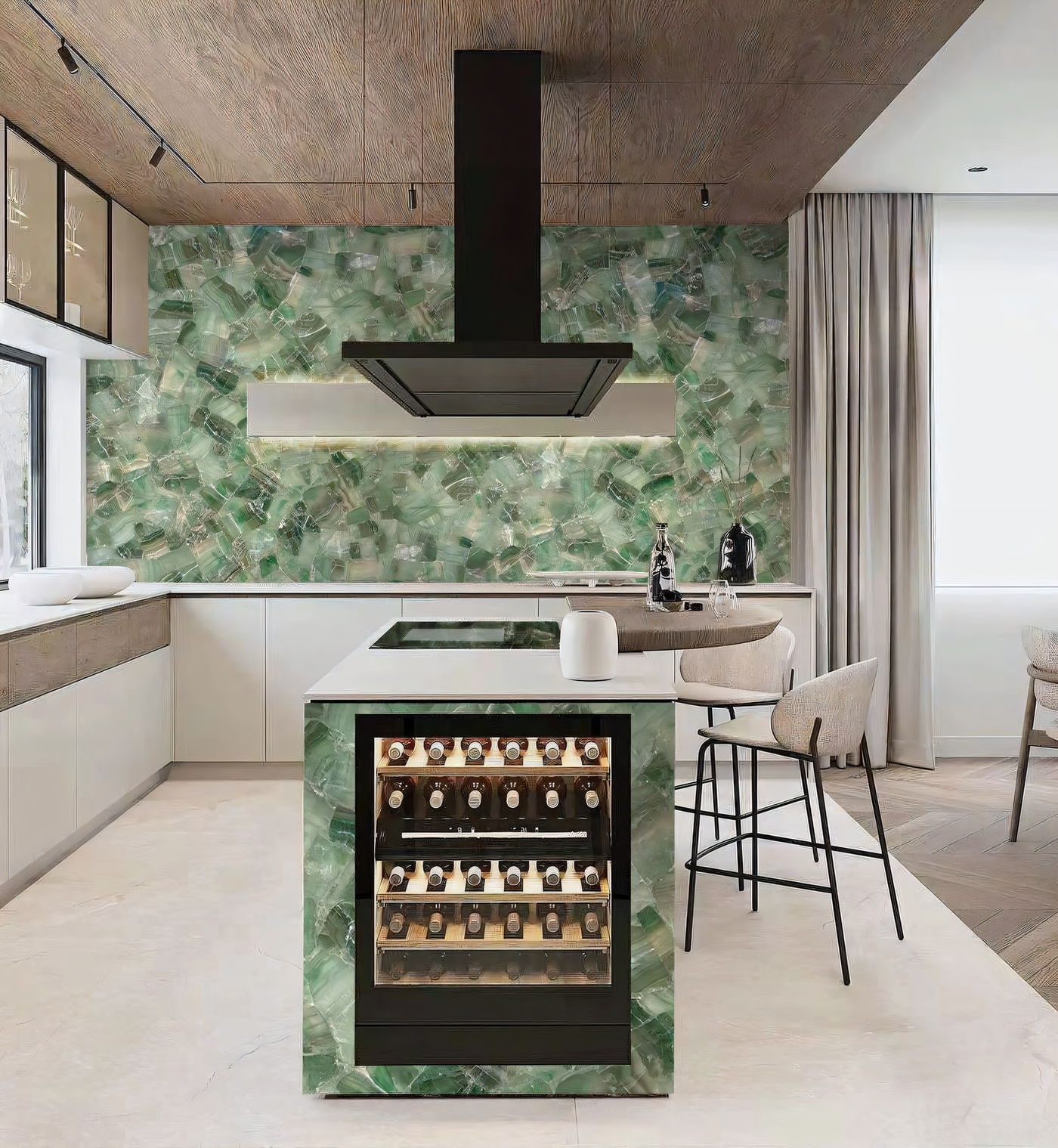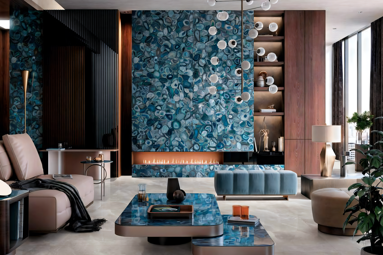 A geode-inspired wall using split amethyst or citrine clusters embedded in resin panels. Raw crystal edges contrast with polished faces, creating a tactile gallery for meditation spaces. UV-resistant and sound-dampening, it doubles as an energy grid for holistic interiors.