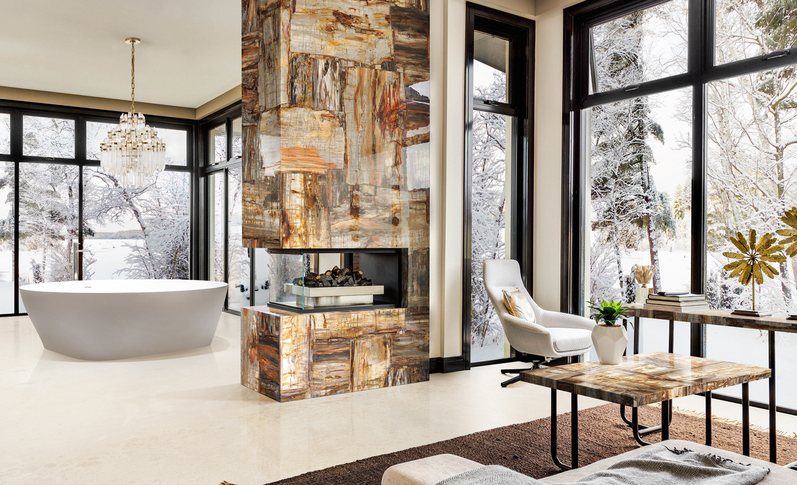 Modernist Homes: Floating fossil slabs contrast glass-encased fire chambers