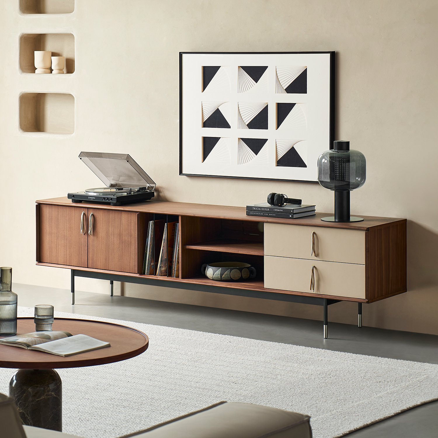 A floating TV stand with cable management hides gaming consoles and wires. Adjustable shelves fit TVs of all sizes, while built-in LED lighting adds ambiance. Available in matte lacquer or wood finishes to complement Nordic or décors.