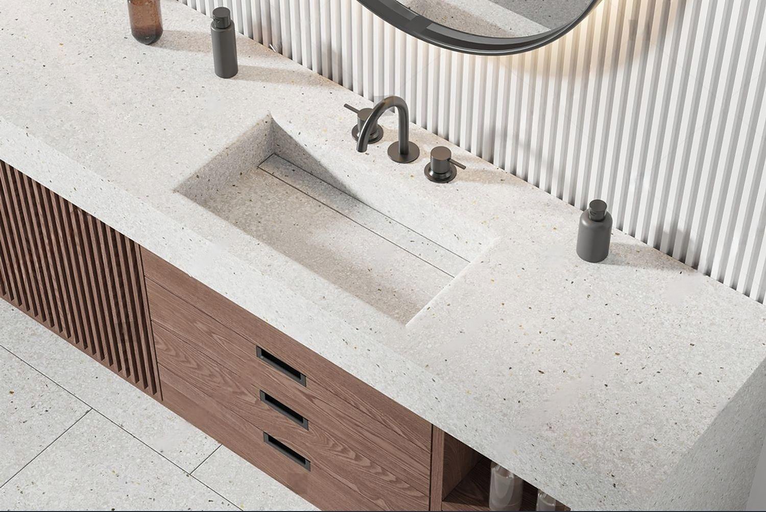 This granite vanity integrates sink and countertop for easy cleaning. Waterproof and mold-resistant, its flecked surface adds organic charm to modern bathrooms. Customize with integrated storage or floating designs.